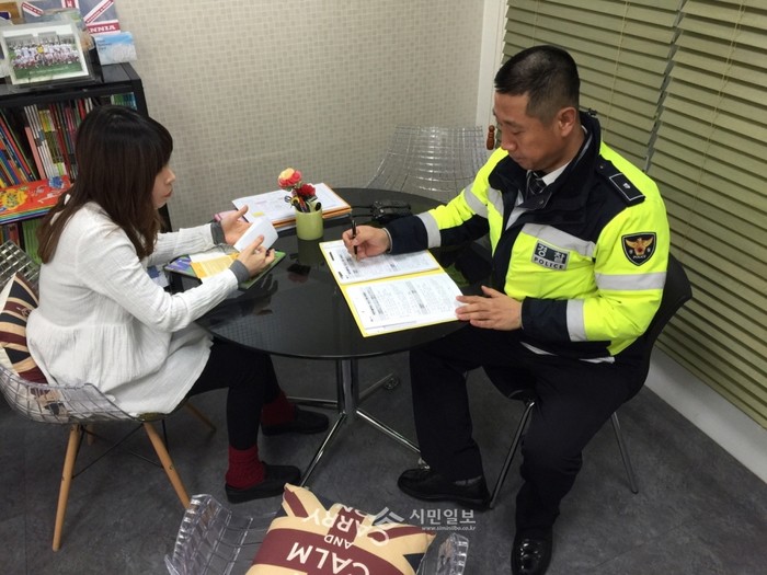 인천 남부경찰서가 3일 지역내 유치원과 학원 등을 방문해 어린이 통학차량 신고의무에 대한 홍보활동을 실시했다. 이는 최근 도로교통법 개정으로 어린이 통학차량 신고가 의무화됨에 따른 것이다. 사진은 한 경찰관이 지역내 학원을 방문해 홍보활동을 하고 있는 모습. (사진제공=남부경찰서)