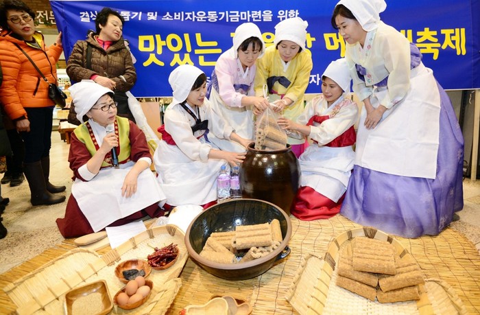 정월대보름을 이틀 앞둔 3일 오후 롯데백화점 부산본점 지하 1층에서 부산여성소비자연합 회원들이 전통 장 담기 시연을 하고 있다. 부산여성소비자연합은 오는 19일까지 결식아동돕기 메주 판매행사를 진행한다.