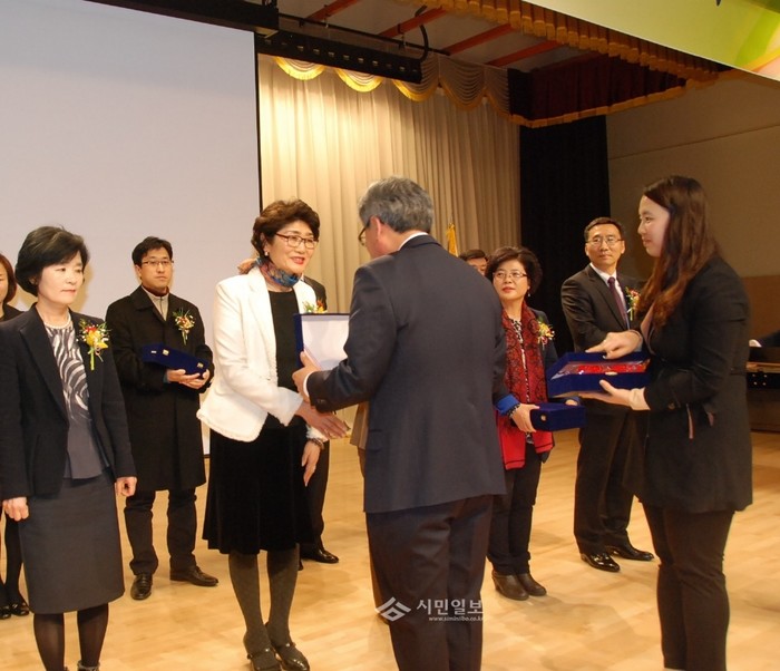 최근 실시된 한국도서관협회 정기총회에 참가한 김춘화 서울 은평구립도서관장이 지하철역 예약 대출 반납기 세계 최초 설치 등의 다양한 서비스를 인정받아, 공공도서관 분야 최고권위인 '제47회 한국도서관상(단체상)'을 받고 있다. (사진제공=은평구청)