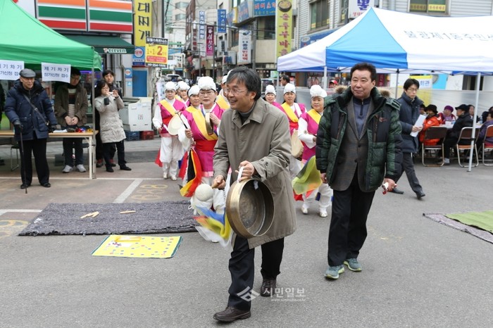 최근 은평구 불광1동에서 실시된 정월대보름 맞이 '민속놀이 한마당 축제'에 참가한 김우영 구청장이 풍물놀이패와 함께 커다란 징을 치며 골목을 돌고 있다.(사진제공=은평구청)