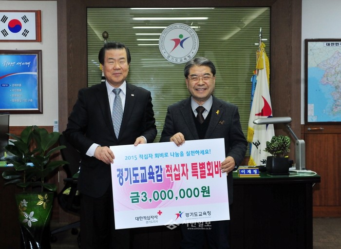 이재정 경기도교육감은 지난 3일 오후 도교육청에서 대한적십자사 경기도지사 김훈동 회장에게 '2015년 적십자 특별회비'를 전달했다. 이 교육감과 김 회장은 이 자리에서 적십자활동 및 꿈의 학교 등 다양한 교육협력방안을 논의했다. 특별회비 전달 후 이 교육감과 김 회장이 기념촬영을 하고 있는 모습.(사진제공=경기도교육청)