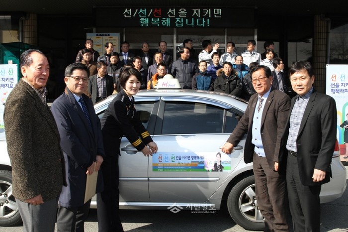지난 4일 서울 도봉구경찰서 2층 비전홀에서 열린 지역내 운수업계와 업무협약식·간담회에서, 참가자들이 '선선선(교통안전선·질서유지선·배려양보선) 선을 지키면 행복해져요' 홍보 스티커를 택시에 부착 후 기념촬영을 하고 있다. (사진제공=도봉경찰서)