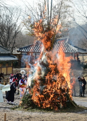 정월대보름을 맞아 5일 오후 경기 용인 한국민속촌에서 열린 달집태우기에서 관람객들이 새해 소원이 이루어지기를 기원하고 있다.