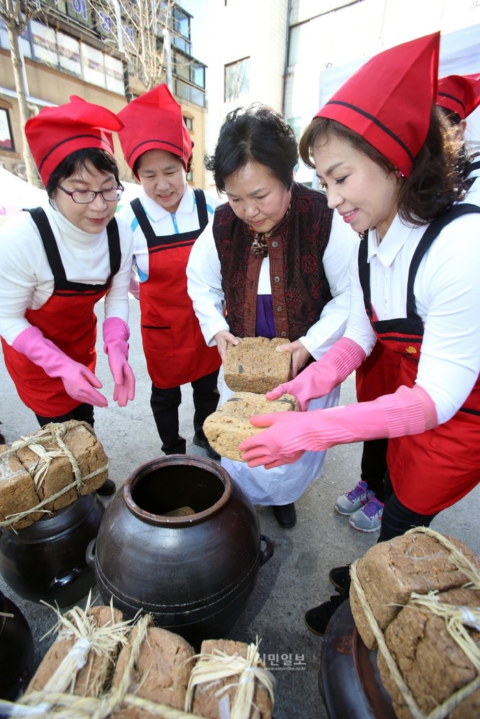 최근 서울 송파구 풍납2동 주민센터에서 열린 ‘제3회 오늘은 장 담그는 날’ 행사에 참여한 ‘전통장 담그기’ 강좌 수강생들이 깔끔히 닦인 장독에 메주를 차곡차곡 넣고 있다. (사진제공=송파구청)