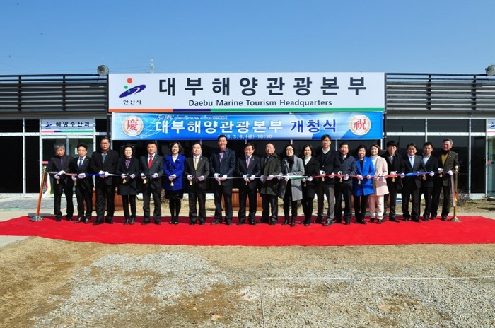 경기 안산시는 최근 시의원 및 국회의원, 지역주민 등 200여명이 참석한 가운데 '대부해양관광본부 사무실 개청식'을 열었다. 사진은 이날 개청식에 참석한 관계자들이 테이프 커팅식에 앞서 기념촬영 중인 모습. (사진제공=안산시청)