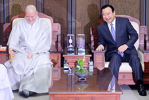 이완구 국무총리가 9일 오전 서울 종로구 대한불교조계종 총무원을 예방해 조계종 자승 총무원장과 환담을 나누고 있다.