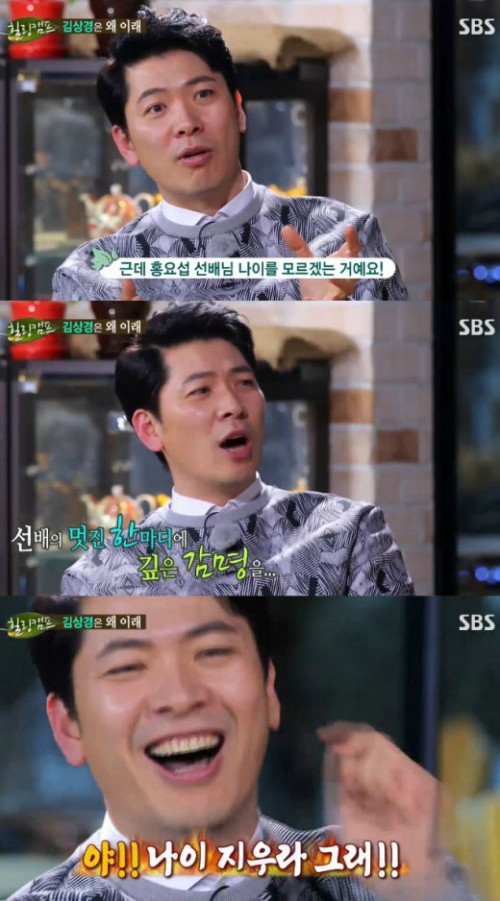 이날 김상경은 포털사이트에서 생년월일을 지운 것에 대해 “홍요섭 선배님을 어렸을 때부터 좋아했다. 우연히 모임에서 만나 함께 운동을 하게 됐다”며 말문을 열었다.