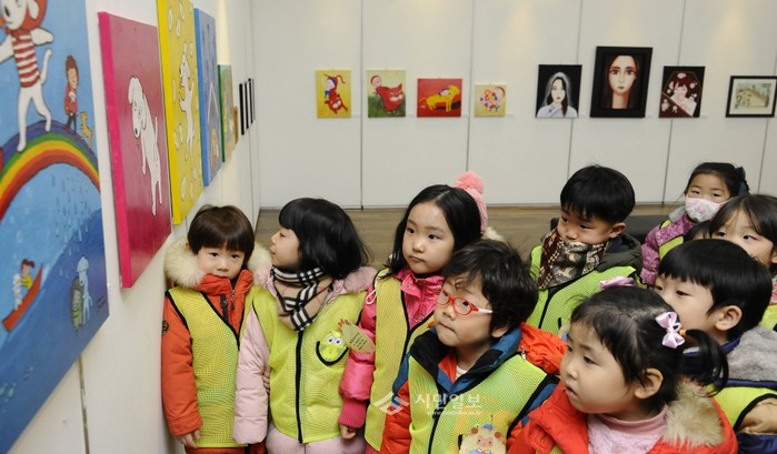 서울 광진구가 10일 광진문화예술회관 나루아트센터 1층에서 '동화 속에서 놀자' 작품전시회를 개최했다. 이날 전시에는 지역내 어린이집 원아 50여명이 참가해 동화책 속 원화와 다양한 작품을 감상하고 체험하는 시간을 보냈다. 사진은 전시회를 찾은 어린이들이 동화책 속 원화 작품을 감상하고 있는 모습. (사진제공=광진구청)