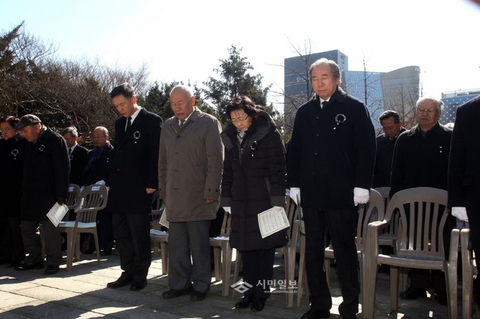 10일 오전 11시 서울 강남구 도산공원에서 열린 ‘도산 안창호 선생 순국 77주기 추모식’에 참석한 신연희 강남구청장(앞열 오른쪽에서 두 번째)이 헌화 후 묵념을 하고 있다.(사진제공=강남구청)