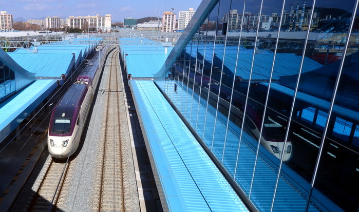 10일 오후 2시11분쯤 광주 광산구 광주송정역에 호남고속철도 신형 KTX가 진입하고 있다. 호남고속철은 시운전을 마친 뒤 오는 4월 개통되며 광주송정역에서 서울 용산역까지 1시간33분이 소요된다.