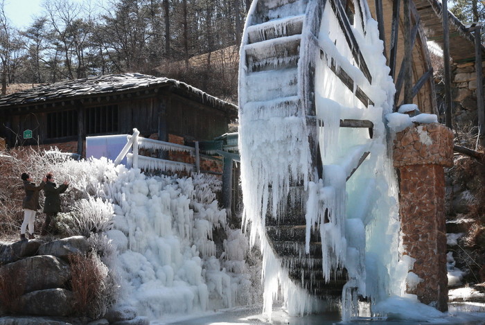 꽃샘추위에 꽁꽁 언 물레방아