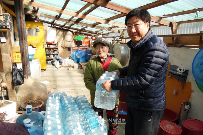 인천 강화군 양사면은 지난 10일 먹는 물이 부족해 생활에 불편을 겪는 북성리 주민 등 16가구 34명에게 미추홀 참물 1920병(1.8L)을 지원했다. 사진은 양사면 관계자가 한 주민에게 먹는 물을 전달하고 있는 모습. (사진제공=강화군청)
