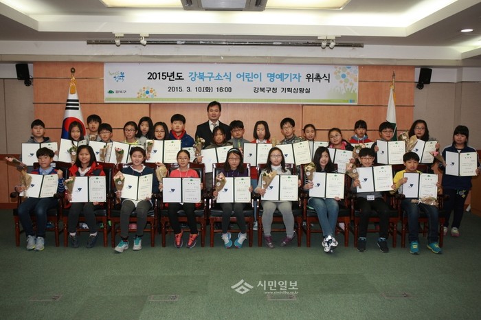 서울 강북구가 지난 10일 오후 4시 구청 기획상황실에서 ‘2015년 소식지 어린이 명예기자’ 27명을 위촉했다. 어린이 명예기자는 1년간 구 소식지를 통해 어린이들만의 시각으로 풀어낸 지역소식을 주민에게 전달할 예정이다. 사진은 위촉식이 끝난 후 박겸수 강북구청장과 명예기자들이 기념촬영을 하는 모습. (사진제공=강북구청)