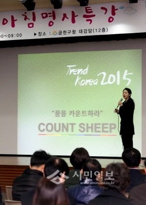 12일 서울 금천구가 12층 대강당에서 전직원을 대상으로 실시한 '2015년 경제흐름과 소비트렌드에 대한 강의'에 참가한 800여명의 구청직원이 <트렌드코리아 2015>의 공동저자인 서울대 전미영 교수가 진행하는 강의를 듣고 있다.(사진제공=금천구청)