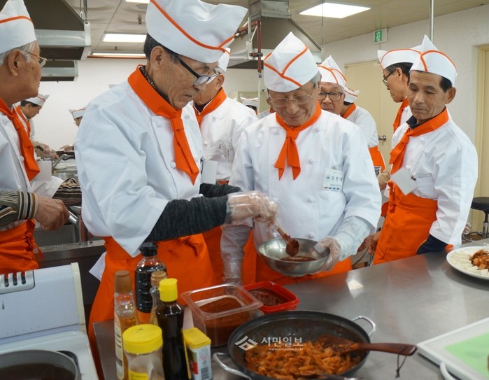 경기 양평군보건소가 보건복지프라자에서 지난 11일 '요리하는 청춘' 프로그램을 시작했다. 이 프로그램은 18명의 남성 노인들을 대상으로 음식재료 다듬기, 조리기구 사용하기 등의 교육과 요리 실습 등을 하는 요리 교실이다. 사진은 이날 프로그램에 참여한 노인들이 돼지고기 두부김치 두루치기를 만들고 있는 모습. (사진제공=양평군청)