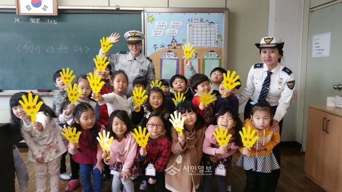 인천 중부경찰서는 12일 신흥초등학교에서 1학년 신입생들을 대상으로 등굣길 엄마손 캠페인 및 어린이 교통안전교육을 실시했다. 교육은 교통안전 동영상을 통해 ▲초록색 불에 왼손 들고 건너기 ▲무단횡단하지 않기 등 교통사고 위험성에 대한 내용으로 진행됐다. 사진은 이날 교육에서 어린이들이 '멈춤'이 적힌 손바닥 모양의 카드를 들고 기념촬영한 모습. (사진제공=중부경찰서)