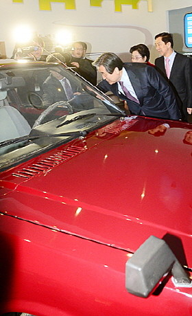 울산을 방문중인 새누리당 김무성 대표가 12일 오전 울산박물관 방문해 우리나라 최초로 현대자동차가 만든 포니 승용차를 살펴보고 있다.