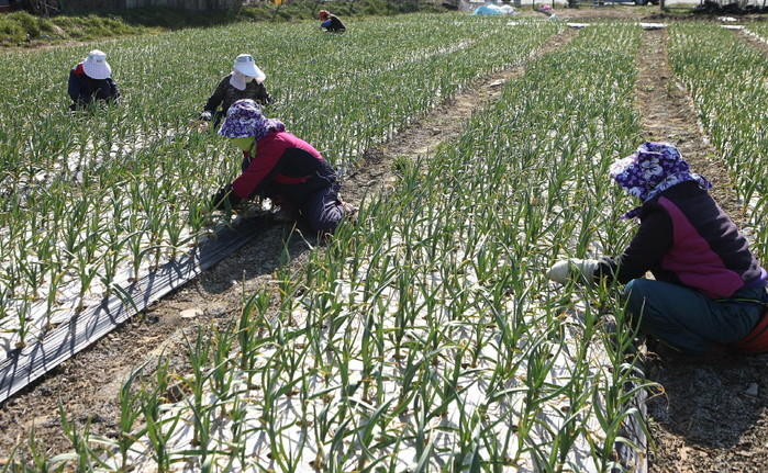 12일 오후 전남 강진군 성전면 동령마을 앞 마늘밭에서 마을 주민들이 제법 자란 잡초를 제거하느라 분주하게 움직이고 있다. (사진제공=강진군청)