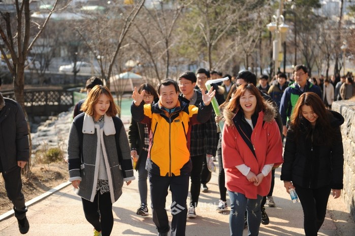 지난 12일 오후 서울 중랑구에서는 나진구 구청장과 신규공무원 52명이 중랑둘레길과 전통시장을 탐방하는 중랑문화탐방이 열렸다. 사진은 나 구청장이 신규직원들과 함께 중랑둘레길을 걸으며 둘레길에 대한 설명을 하고 있는 모습. (사진제공=중랑구청)