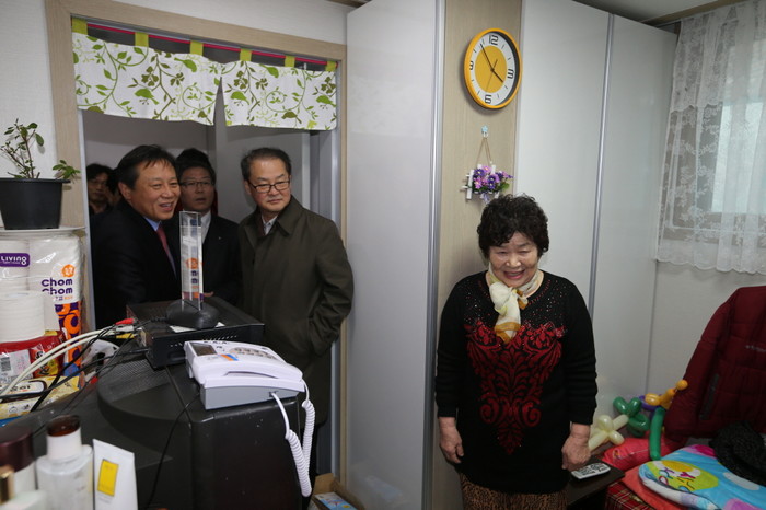 | ▲ 서울 금천구가 지역노인들을 위한 '공공원룸주택'을 건설해 지역내 홀몸노인들에게 원룸을 제공했다. 사진은 차성수 구청장(왼쪽)이 공공원룸주택 내 한 노인의 원룸을 방문한 모습.(사진제공=금천구청) | ||