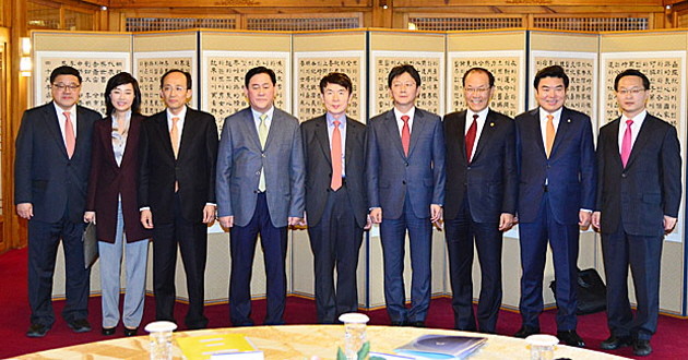15일 오후 서울 종로구 총리공관에서 열린 당·정·청 정책조정협의회에 앞서 참석자들이 기념촬영을 하고 있다. 왼쪽부터 청와대 안종범 경제수석, 조윤선 정무수석, 추경호 국무조정실장, 최경환 경제부총리 겸 기획재정부 장관, 현정택 청와대 정책조정수석, 새누리당 유승민 원내대표, 황우여 사회부총리 겸 교육부 장관, 새누리당 원유철 정책위의장, 조해진 원내수석부대표.