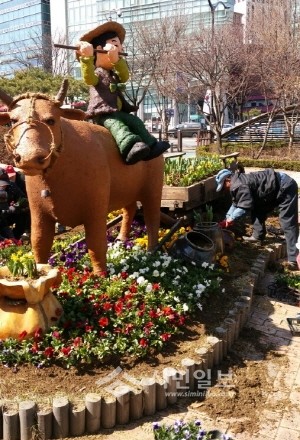 성동구가 최근 봄을 맞아 구청 광장에 있는 '피리부는 목동' 토피어리(식물장식품) 앞 화단에 꽃을 심었다. 사진은 구청 공원녹지과 직원들이 화단에 꽃을 심고 있는 모습. (사진제공=성동구청)