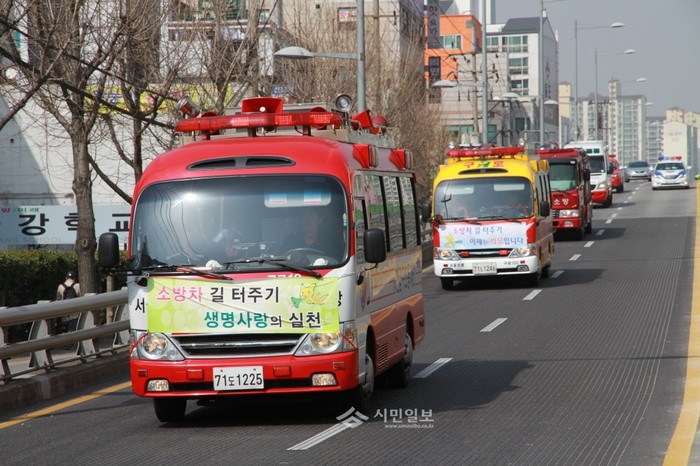 서울 구로소방서가 16일 지역내 전통시장 및 상습 정체구간 2곳에서 '소방차 길 터주기 훈련'을 실시했다. 이번 훈련은 시민의 양보의무 및 의식을 제고하고 황금시간을 확보하기 위해 마련됐다. 사진은 상습정체구간에서 '소방차 길 터주기 생명사랑의 실천' 문구를 달고 훈련 중인 구급차 등 소방차량의 모습. (사진제공=구로소방서)
