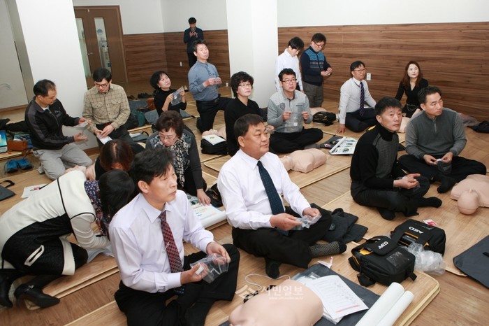 지난 16일 서울 강북구의회 김동식 의장을 비롯한 12명의 의원들은 강북구한방진료센터내 응급의료교육장에서 진행된 '생명을 살리는 두손의 기적 심폐소생술 체험교육'을 다녀왔다. 사진은 강사로부터 심폐소생술 강의를 받고 있는 의원들의 모습. (사진제공=강북구의회)