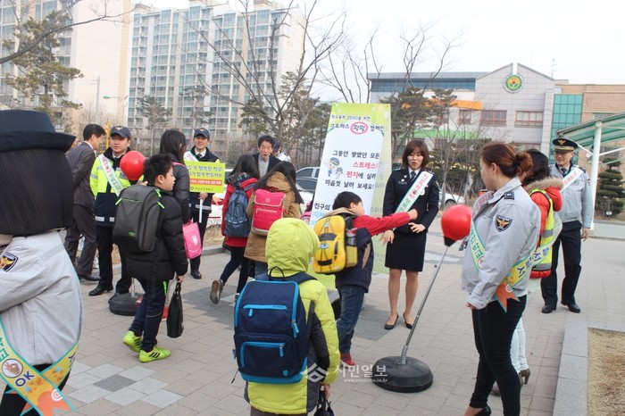 경기 부천시 동산초등학교 어머니폴리스는 17일 학교폭력전담경찰관 및 오정경찰서 경찰관들과 함께 학교폭력예방 캠페인을 실시했다. 사진을 이날 등교 중인 학생들을 대상으로 캠페인을 펼치는 어머니폴리스 회원들과 경찰관들의 모습. (사진제공=부천교육지원청)