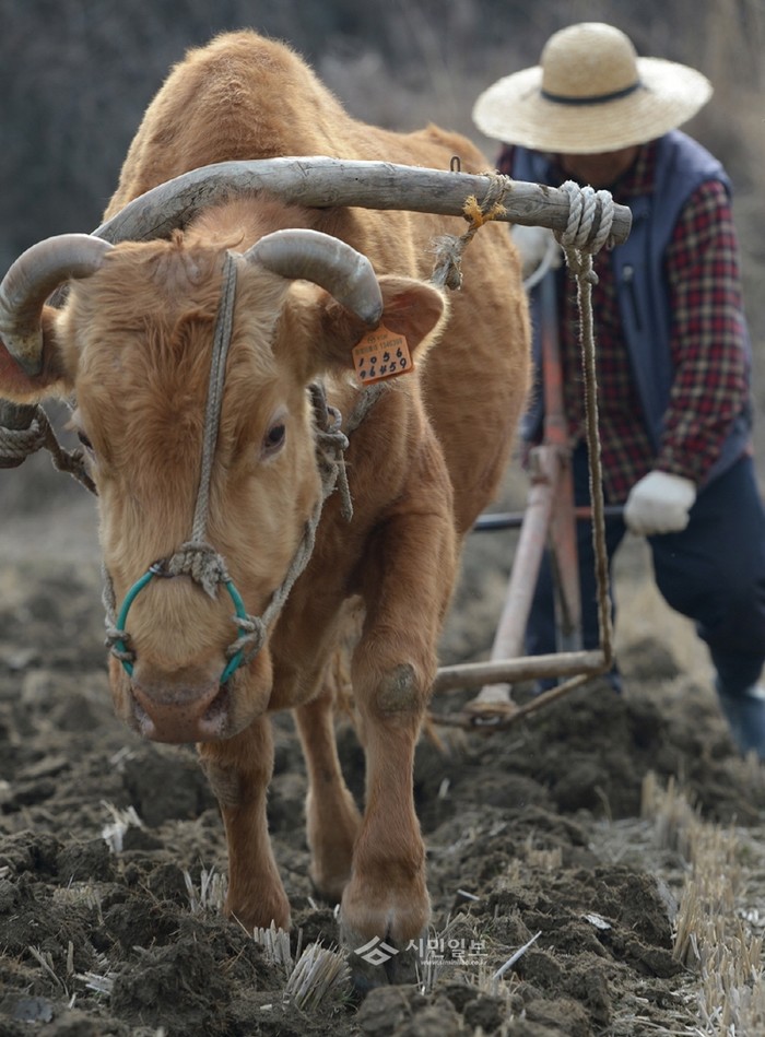 절기상 춘분을 나흘 앞둔 17일 경남 거창군 남상면 임불마을 논에서 이상계씨가 누런 황소를 앞 세우고 쟁기질을 하고 있다.(사진=거창군 제공)