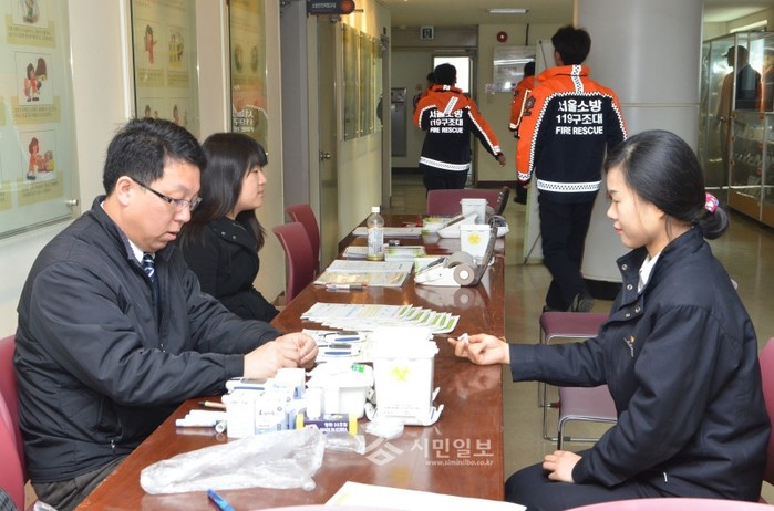 서울 서대문소방서는 17일 오전 9시 소방서 4층 대강당에서 전직원을 대상으로 공직기강확립을 위한 특별정신교육 및 대시민 친절마인드 향상교육을 실시했다. 사진은 이날 교육과 병행해 진행된 대사증후군 등 기초 건강검사를 실시하는 모습 (사진제공=서대문소방서)