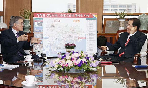 문재인 새정치민주연합 대표가 18일 오전 경남 창원시 경남도청을 방문해 홍준표 경남도지사와 무상급식 등 현안에 대해 의견을 나누고 있다.