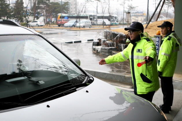 강원 강릉경찰서 기동대원이 18일 오후 강릉시 라카이샌드파인리조트 리셉션동 지하주차장으로 들어가는 차량을 검문 후 통과시키고 있다. 경찰은 17~19일 라카이샌드파인리조트에서 열리는 2018 평창동계올림픽 개최 준비를 위한 국제올림픽위원회(IOC)와 평창동계올림픽조직위원회 간 제4차 IOC 조정위원회 회의의 안전을 위해 경력을 투입했다.