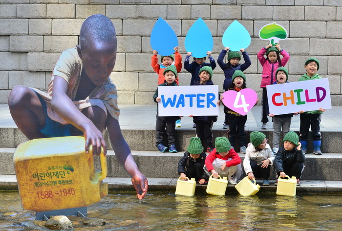 19일 '세계 물의 날'을 맞아 물을 뜨고 있는 아프리카 어린이 모습의 조형물이 설치된 서울 청계천 모전교 부근에서 어린이들이 초록우산어린이재단에서 실시하는 '워터 포 차일드 캠페인'을 펼치며 물을 뜨고 있다. /뉴시스