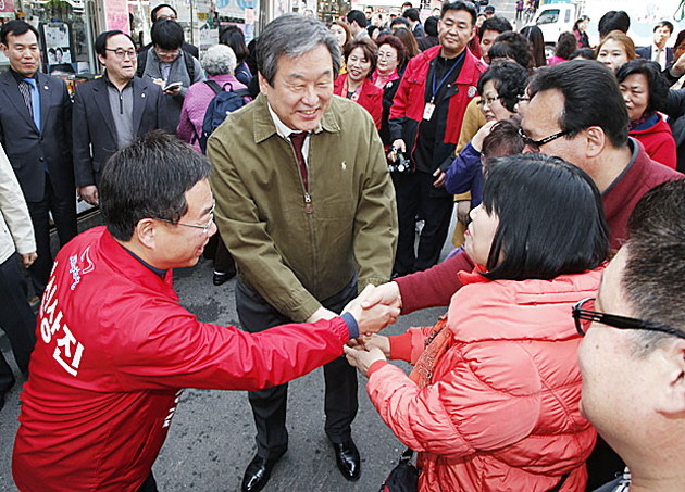새누리당 김무성 대표가 4.29재보선 성남중원에 출마하는 신상진 후보와 19일 오후 경기도 성남시 중원구 상대원시장을 찾아 시민들과 악수하고 있다.