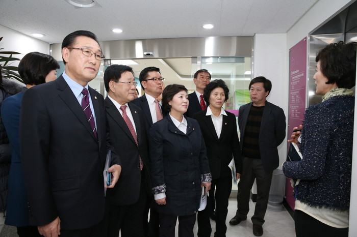 최근 송파구 산모건강증진센터를 방문한 서울 종로구의회 행정문화위원(왼쪽부터 선상선·김복동·안재홍·경점순·김준영·배효이 의원)들이 센터 관계자에게 운영현황을 보고받고 시설을 시찰하고 있다. (사진제공=종로구의회)