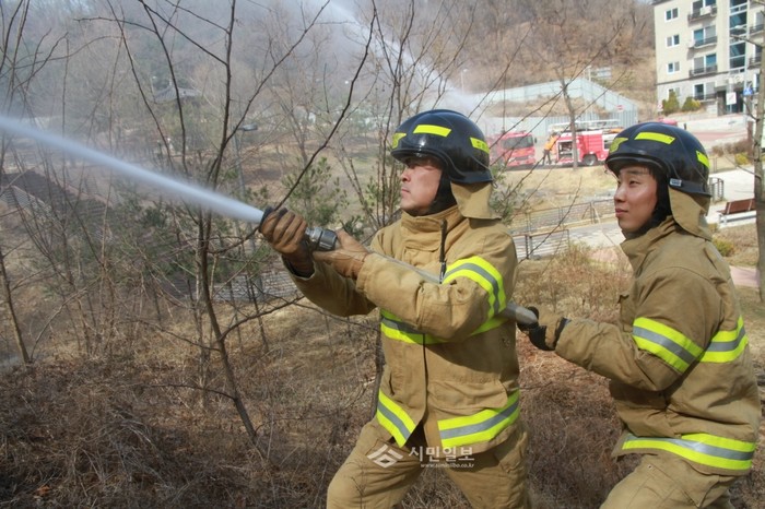 서울 구로소방서는 지난 20일 오후 2시 봄철 산불예방 및 진압대책의 일환으로 구로구 항동 소재 천왕산에서 산불진화 현지적응훈련을 실시했다. 이날 훈련에서 소방관들은 산불재난 대응 매뉴얼 숙달 및 위험 지형을 파악하고 대형산불 발생 대응 훈련을 펼쳤다. 사진은 소방관들이 산불진화 대응 훈련을 진행 중인 모습. (사진제공=구로소방서)