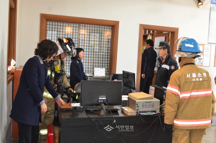 최근 서울 서대문소방서가 신촌역사에서 문화재에 대한 초기 대응능력을 강화하기 위해 실시한 ‘상반기 현지적응훈련’에서 소방공무원과 문화재 관계자가 합동훈련을 하고 있다. (사진제공=서대문소방서)