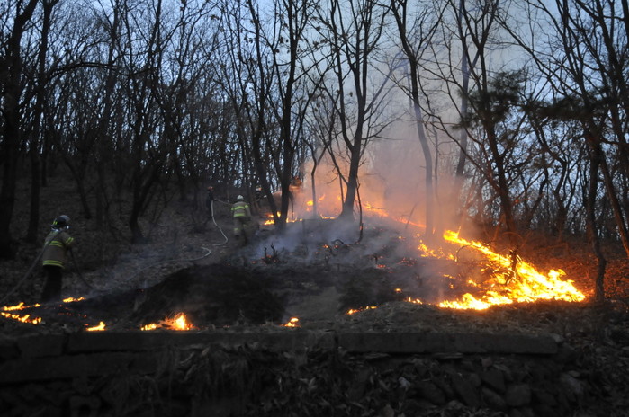 지난 22일 잡목 및 묘지 잔디 등 50여평을 태운 담배꽁초로 추정되는 화재가 발생한 서울 구로구 개봉로3길 개웅산 중턱에서 구로소방서 소방대원들이 진화작업을 실시하고 있다.(사진제공=구로소방서)