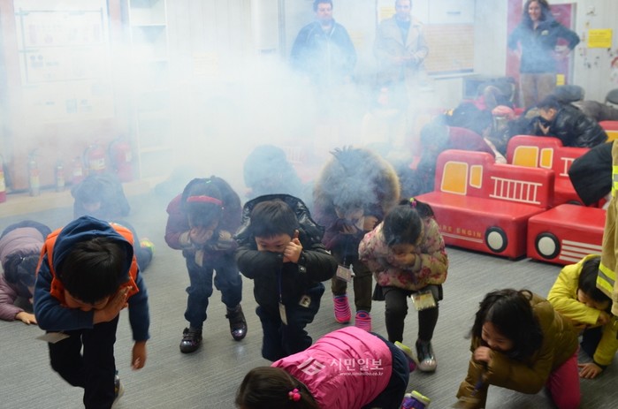 서울 강남소방서는 23일 오전 본서 2층 안전체험교실에서 대치게이트 어린이집 교사 및 어린이 40여명을 대상으로 '연기대피 및 소화기 체험교육'을 실시했다. 사진은 연기대피 체험교육에 참여한 어린이들이 연기를 피해 대피하고 있는 모습. (사진제공=강남소방서)