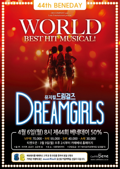 카페베네(대표 김선권)가 오는 4월 베네데이를 맞아, 뮤지컬 <드림걸즈>를 50% 할인된 가격으로 제공한다.