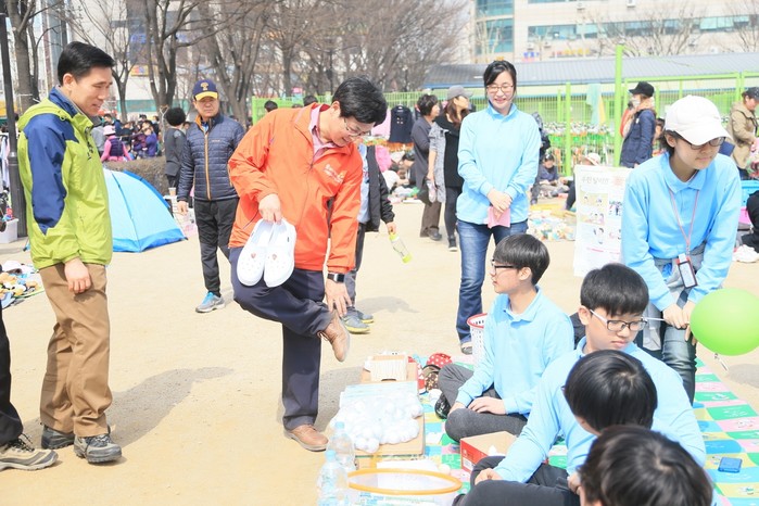 경기 고양시 덕양구청 광장에서 최근 '제1회 푸른고양 나눔장터'가 진행됐다. 장터에는 주민 800여명이 판매자로 나서 '참가비는 없으나 수익의 10% 기부하기', '상거래 행위 안하기' 등 실천수칙을 준수하며 개인장터를 운영했다. 사진은 이날 장터에 참여한 최성 고양시장이 신발을 골라 신어보고 있는 모습.(사진제공=고양시청)