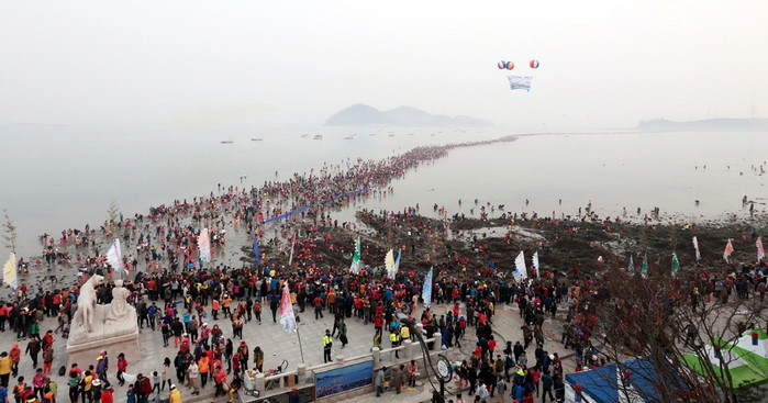 전남 진도군은 지난 20일부터 4일간 열린 '제37회 신비의 바닷길 축제'에 61만명의 국내외 관광객이 방문하는 대성황을 이뤘다고 24일 밝혔다. 사진은 이번 축제기간 관광객들이 갈라진 바닷길이 직접 체험하고 있는 모습.(사진=진도군 제공)