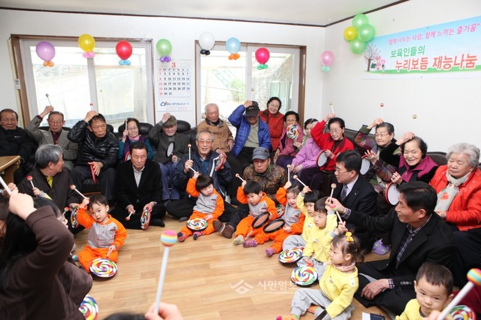 경기 수원시 권선구가 지난 24일 보육인들의 '누리보듬 재능나눔 행사'를 구운동 강남아파트 경로당에서 진행했다. 이날 행사에는 아파트내 어린이집 아동들이 노인들에게 율동을 선보였다. 사진은 어린이집 아동들과 경로당 노인들이 기념촬영한 모습. (사진제공=권선구청)