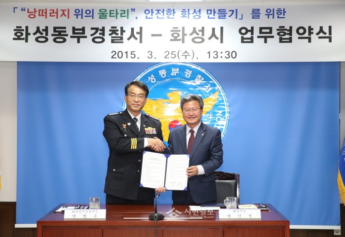 경기 화성시는 화성동부경찰서와 25일 경찰서 소회의실에서 '안전한 화성시 만들기' 업무협약을 체결했다. 이를 통해 양측은 U-CITY 통합시스템 운영, 방범용 폐쇄회로(CC)TV 설치, 가로등·보안등 설치 등에서 상호 협력키로 했다. 사진은 채인석 시장(오른쪽)과 박명수 서장(왼쪽)이 기념촬영한 모습. (사진제공=화성시청)