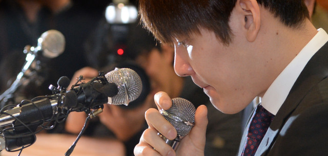 박태환은 27일 오후 서울 송파구 잠실관광호텔에서 기자회견을 열었다. 지난 23일 국제수영연맹(FINA) 청문회에서 18개월 선수자격 정지 처분을 받은 지 4일 만이다.