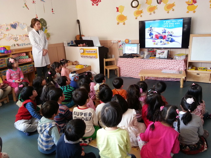 경기 부천시 성곡초등학교 병설유치원은 최근 오정보건소의 협조를 받아 원아 50명을 대상으로 흥미있는 동화구연 및 캐릭터와 함께하는 구강교육을 실시했다. 사진은 홍보영상을 시청 중인 아이들의 모습. (사진제공=부천교육지원청)