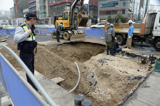 29일 오전 지하철 9호선 공사중인 서울 강남구 봉은사와 종합운동장 사이 대로 한가운데에서 거대 싱크홀이 발생해 경찰과 관계자들이 복구작업을 벌이고 있다.