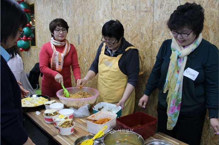 최근 서울 은평구가 마을공동체 활동 중인 주민 40여명과 함께 은평마을지원센터에서 실시한 ‘모여라 은평마을! 3월 마을집담회’에 참가한 주민들이 직접 준비해온 밥과 은평마을지원센터에서 준비한 먹거리로 비빔밥을 만들어 나눠 먹고 있다.(사진제공=은평구청)