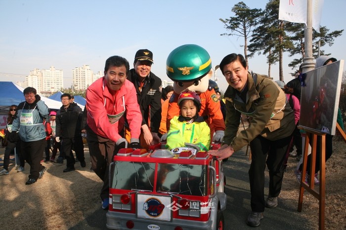 강동구가 최근 주민들의 안전의식을 함양을 위해 '안전도시 강동 선포식'을 열었다. 이날 선포식에는 이해식 강동구청장과 유관기관과 주민단체 등이 참여했다. 사진은 이해식 구청장(오른쪽)이 한 어린이의 미니소방자동차 탑승체험을 돕고 있는 모습. (사진제공=강동구청)